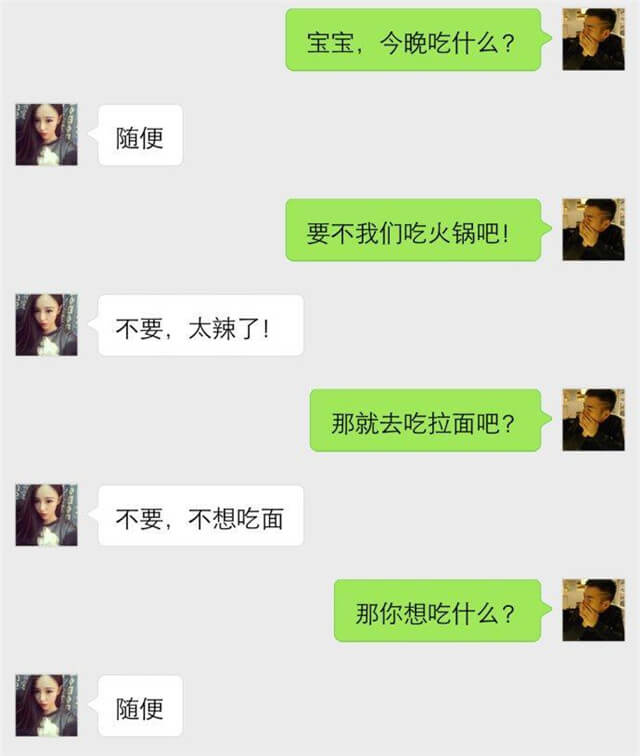 很多兄弟會遇到這樣一種情況,不管是吃飯還是買東西,問女生的時候,女生老說“隨便”,但當我們做出選擇后,往往又會遭到女生的埋怨,這種頭疼的情況,我相信很多兄弟都不知道如何應對?