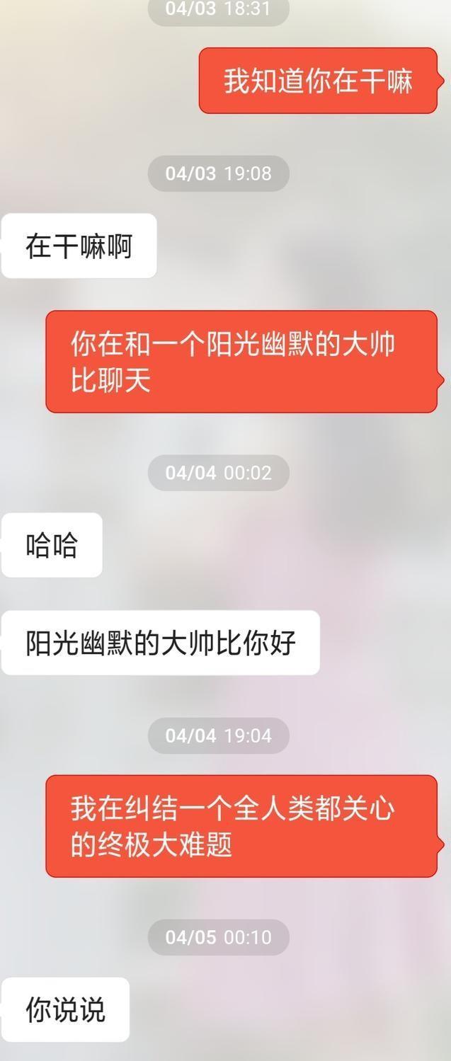 這個(gè)聊天是把好奇式聊天和驕傲自大的聊天結(jié)合起來(lái)。先運(yùn)用好奇的方式引起女生的注意,然后利用驕傲自大的幽默方式,讓女生覺(jué)得你很好玩而且自信。