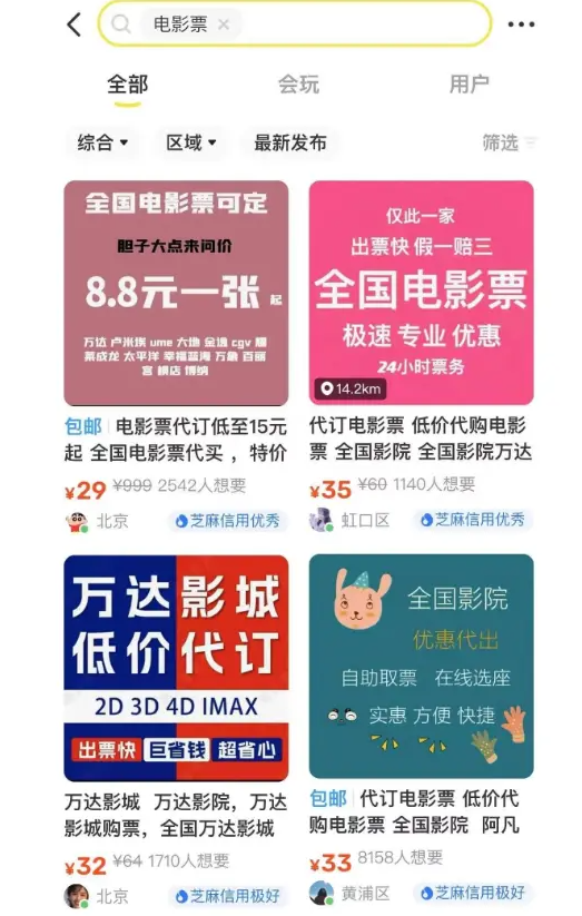 在某魚、某寶、轉(zhuǎn)轉(zhuǎn)等平臺上,可以看到賣電影票的銷量都非常高。